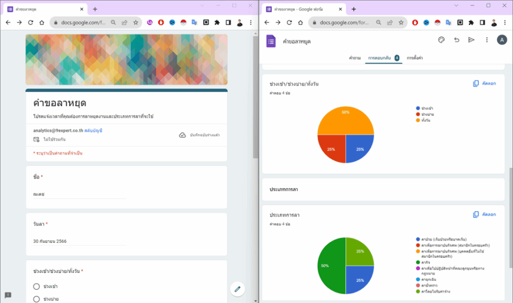 - ดูผลลัพธ์ผ่าน Google Sheets หรือในหน้ารวบรวมข้อมูลของ Google Form