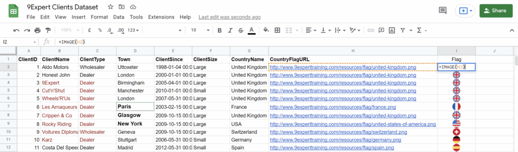 ฟังก์ชัน IMAGE สำหรับแปลง URL ของรูปภาพให้แสดงเป็นรูปภาพ โดยใน Cell I2 ใส่สูตรว่า =IMAGE(H2)