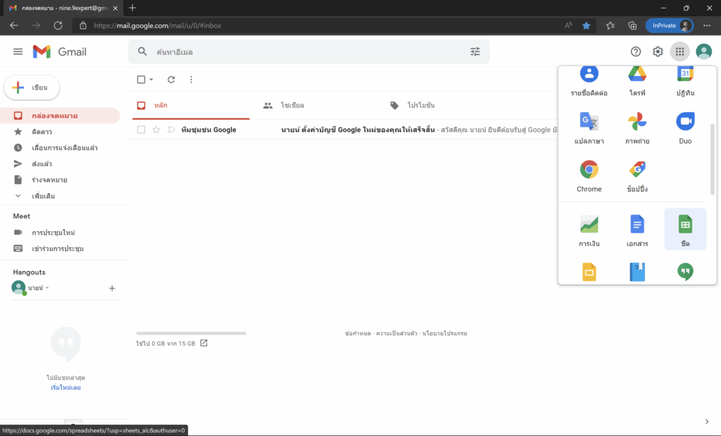 เมื่อสมัครเข้ามาเรียบร้อย หรือเข้ามาที่ Gmail เราสามารถเข้าใช้งาน Sheets หรือ ชีต ได้ด้วยคลิกที่ App Google ที่มุมบนขวา (รูป 9 จุด) แล้วเลือก Sheets หรือ ชีต